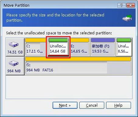 在彈出的移動分區(qū)選項框中選中要移動的位置(必須是未劃分的空間),然后按Next,要注意的是,下圖中在F盤后還有一個未劃分的空間,這個空間也是可以移動的,不過如果E 盤里的資料要是超過了未劃分空間大小的話是不能移動的,移動分區(qū)不會損壞分區(qū)資料。