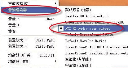 如果本本連接了HDMI功放,建議通過媒體播放器設(shè)置HDMI音頻。以Kmplayer為例,運行軟件后,依次進入“音頻管理→音頻渲染器”菜單后,然后選擇“ATI HD Audio rear output”選項(如圖4)。