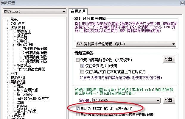 接著進入音頻設(shè)置選項,點尋啟用SPDIF”(如圖5),這樣用Kmplayer播放高清電影時,可以實現(xiàn)畫面與音頻的同步傳輸,但音頻部分由功放來解碼,從而獲得更好的音質(zhì)效果。