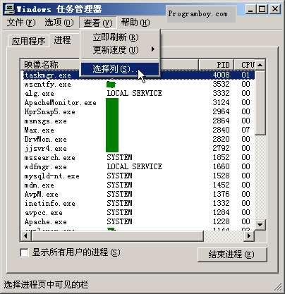 1.結(jié)束進程:調(diào)出windows務(wù)管理器(Ctrl+Alt+Del),發(fā)現(xiàn)通過簡單的右擊當前用戶名的lsass.exe來結(jié)束進程是行不通的.會彈出該進程為系統(tǒng)進程無法結(jié)束的提醒框;鼠標右鍵點擊"任務(wù)欄",選擇"任務(wù)管理器"。點擊菜單"查看(V)"->"選擇列(S)...",在彈出的對話框中選擇"PID(進程標識符)",并點擊"確定"。找到映象名稱為"LSASS.exe",并且用戶名不是"SYSTEM"的一項,記住其PID號.點擊"開始"-->“運行”,輸入"CMD",點擊"確定"打開命令行控制臺。輸入"ntsd –c q -p (PID)",比如我的計算機上就輸入"ntsd –c q -p 1132".