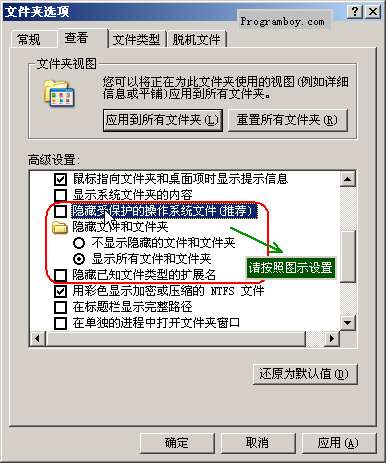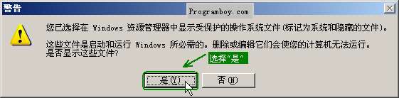 2.刪除病毒文件:以下要刪除的文件大多是隱藏文件所以要首先設(shè)置顯示所有的隱藏文件、系統(tǒng)文件并顯示文件擴展名;我的電腦-->工具(T)-->文件夾選項(O)...-->查看-->選擇"顯示所有文件和文件夾",并把隱藏受保護的操作系統(tǒng)文件(推薦)前的勾去掉,這時會彈出一個警告,選擇是.至此就顯示了所有的隱藏文件了(友情提示:待你把病毒清除后,請把"隱藏受保護的操作系統(tǒng)文件"打上鉤,要不然以后很容易誤刪東西哦).