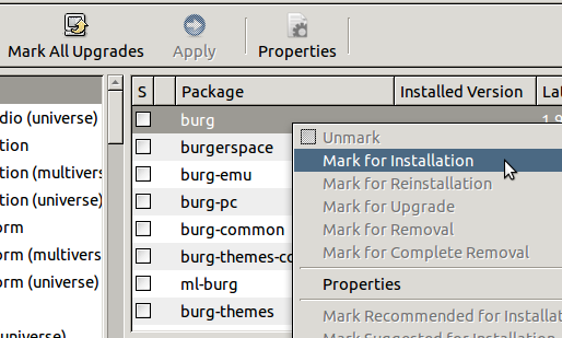 完成以后,打開新立德軟件包管理器,搜索 burg,然后標(biāo)記,以便安裝.