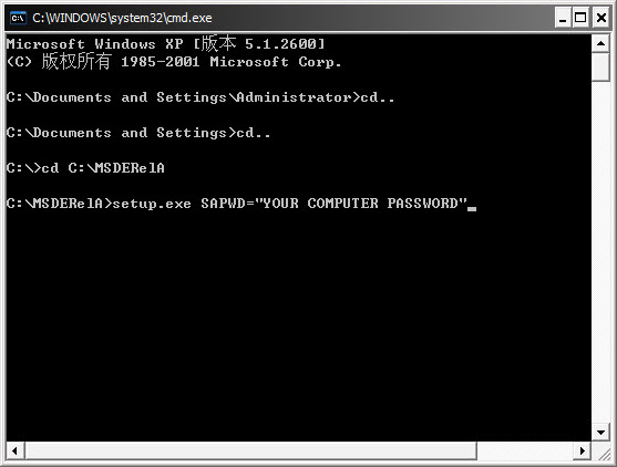 1、命令提示符下進(jìn)入安裝目錄。比如MSDERelA。然后鍵入setup.exe SAPWD="YOUR COMPUTER PASSWORD".安裝成功了。如圖示: