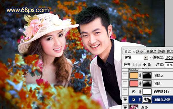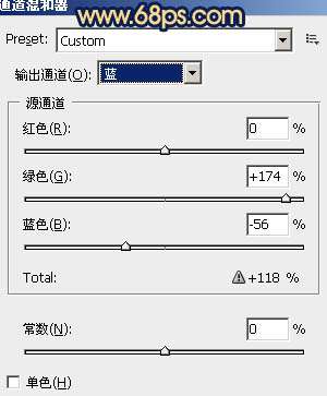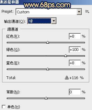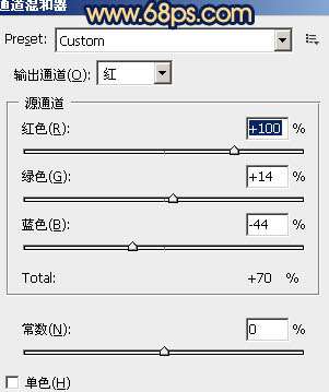 1、打開原圖素材,創(chuàng)建通道混合器調(diào)整圖層,對紅,綠,藍進行調(diào)整,參數(shù)設(shè)置如圖1 - 3。確定后用黑色畫筆把人物部分擦出來,這一步是調(diào)整背景顏色,效果如圖4。