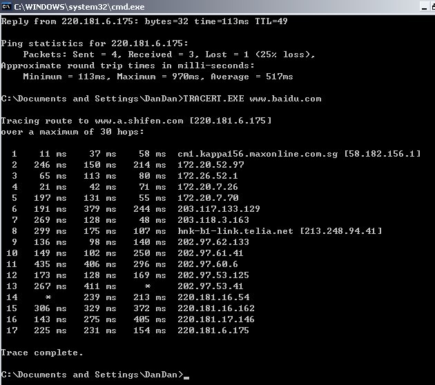 2 接下來ping了www.baidu.com,可以正常返回數(shù)據(jù),顯然DNS服務器也沒問題,此時直接使用獲取到的IP訪問也無法顯示網(wǎng)頁內(nèi)容,使用 TRACERT.EXE www.baidu.com 結(jié)果也顯示整個訪問過程沒有出現(xiàn)問題,網(wǎng)絡那是完全沒有問題。