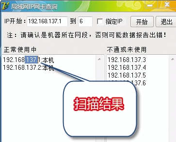 Step02:在Windows 7下需要以管理員身份運行程序才行。點擊“開始”即可正常掃描,期間請注意,掃描的網(wǎng)段一定是電腦所在的網(wǎng)段哦,否則會掃除很奇怪的數(shù)據(jù)。軟件會給出正常使用和未使用的IP地址。
