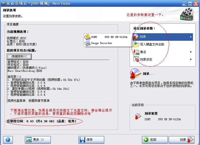 DVD只有4.7G,如果你追求數(shù)量而超出容量的話,它在最后會彈出提示要不要自動(dòng)修改參數(shù)(實(shí)質(zhì)就是悄悄的幫你降低畫質(zhì)和幀數(shù))以適應(yīng)光盤空間,這就看你咯。然后,刻錄,等待,大功告成,去放放看。