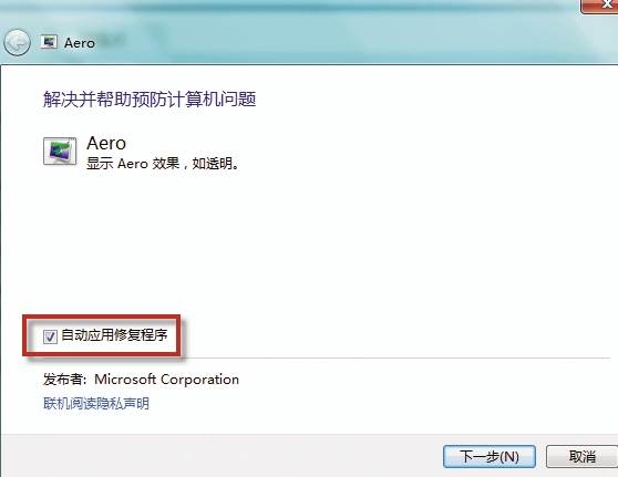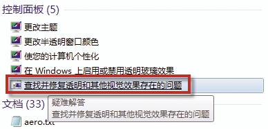 解決方法也比較簡單,在任務(wù)欄的搜索菜單輸入“AERO”進行搜索,在彈出的結(jié)果中點擊“查找并修復(fù)透明和其他視覺效果存在的問題”,在彈出的界面中點擊下一步,系統(tǒng)會找到問題所在,進行自動修復(fù)即可。