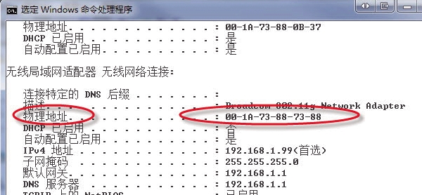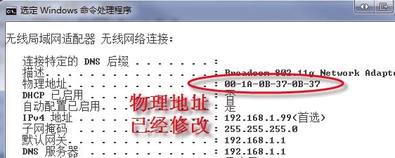 重啟之后,同樣打開開始菜單→所有程序→附件→命令提示符,然后輸入命令ipconfig /all,在這里檢查一下MAC地址是否已經(jīng)修改為老筆記本無(wú)線網(wǎng)卡的MAC地址。如果修改成功,就可以正常上網(wǎng)了。如果網(wǎng)絡(luò)IP地址不是自動(dòng)分配的,那么還需要在適配器選項(xiàng)中輸入第二步獲取的IP參數(shù)。