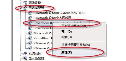 以Windows 7為例子,在新筆記本上右鍵點(diǎn)擊開始菜單中的“計(jì)算機(jī)”,選擇管理。在管理界面中進(jìn)入設(shè)備管理器,在設(shè)備管理器的網(wǎng)絡(luò)適配器選項(xiàng)中,找到無(wú)線網(wǎng)卡。然后點(diǎn)擊右鍵選擇“屬性”。