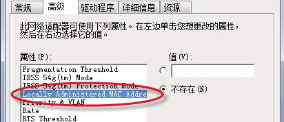 進(jìn)入屬性界面的“高級(jí)”選項(xiàng)卡,找到Locally administered MAC address,如果不是這個(gè)選項(xiàng)也沒關(guān)系,看到有MAC字樣的選項(xiàng)就可以點(diǎn)進(jìn)去看看,如果看到界面如圖,就是這里了。如果這個(gè)界面是中文界面,那選項(xiàng)可能是“網(wǎng)絡(luò)地址”或者類似的字符。