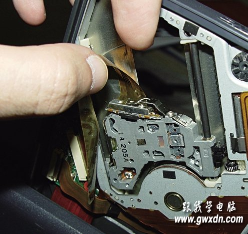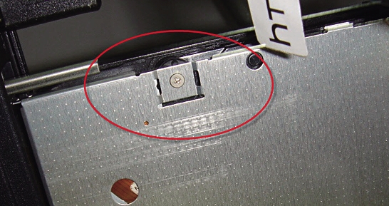 此時放入光盤,假如讀盤或寫盤還是沒有改善的話,那就繼續(xù)往下看吧。彈出光驅托盤,然后關閉本本。把筆記本翻轉過來,打開光盤托盤后面光驅組件的蓋板。友情提醒,取下的小螺絲要放好,別掉進本本里,也不要讓利器劃傷光驅透鏡和排線。