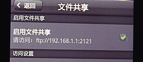 筆記本除了通過手機(jī)AP上網(wǎng),這個(gè)AP功能還可以方便手機(jī)和本本之間進(jìn)行數(shù)據(jù)交換,省去了用USB線纜連接的麻煩。方法很簡(jiǎn)單,在AP軟件中,啟動(dòng)文件共享功能即可??扇止蚕恚部稍O(shè)置特定的共享目錄。共享采用的是FTP方式。