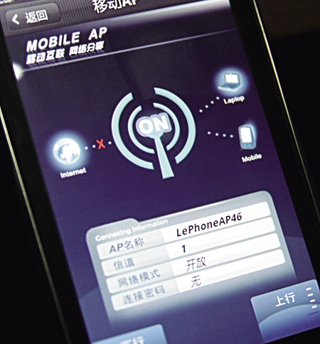 點(diǎn)擊無線AP的圖標(biāo)就能啟動(dòng)AP工具,此時(shí),無線AP功能還處于關(guān)閉狀態(tài),顯示為“OFF”。只用點(diǎn)擊一下,把“OFF”變成“ON”,AP就開始工作了。默認(rèn)的無線SSID號(hào)是LePhoneAP46。默認(rèn)狀態(tài)下,無線網(wǎng)絡(luò)是開放的,周圍的筆記本都能自由連接。為了安全,一定要啟動(dòng)安全加密。這樣筆記本連接時(shí)就需要輸入對(duì)應(yīng)的密碼。這里為了方便說明,仍采用開放式。