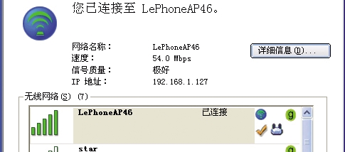 然后,啟動(dòng)筆記本的WIFI無線網(wǎng)卡,搜索周圍的WIFI信號(hào),很快就能看到手機(jī)AP的無線信號(hào),SSID號(hào)為L(zhǎng)ePhoneAP46。然后,點(diǎn)擊連接,就能讓筆記本連接到無線AP。如果進(jìn)行了加密,就需要輸入正確的密碼才能連接。