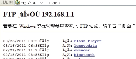 然后,在筆記本的瀏覽器上輸入FTP地址“ftp://192.168.1.1:2121/”,就能在電腦瀏覽器上看到手機(jī)上的文件件和文件。用戶可以方便地把手機(jī)上的文件共享到筆記本,不用再插USB線。