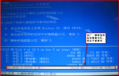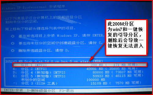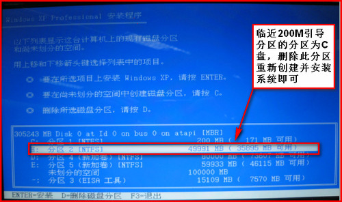 6、重啟光驅引導進入到選擇分區(qū)安裝WINDOWS界面后首先保證引導分區(qū)不被破壞