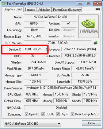 在修改前,打開(kāi)GPU-Z這款檢測(cè)軟件,在主界面的Device ID那一項(xiàng)中可以找到我們顯卡的信息。筆者手上的顯卡為GTX 460,在GPU-Z中顯示的Device ID為“10DE-0E22”,只需要知道后面的“0E22”這個(gè)編號(hào)即可。