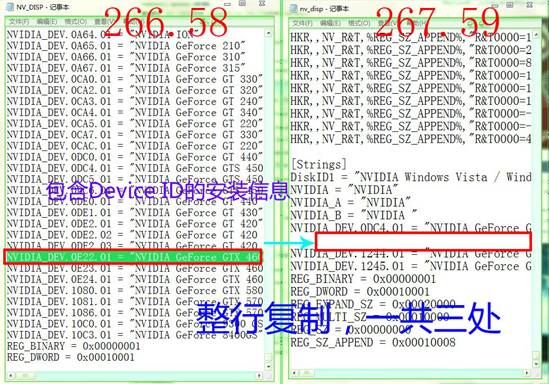 打開(kāi)266.58文件夾,找到Display.Driver文件夾(C:\NVIDIA\DisplayDriver\266.58\Vista 64-bit\International\Display.Driver),用記事本打開(kāi)類型為安裝文件的“NV_DISP”文件,搜索到剛才查到的Device ID。筆者搜索GTX 460的編號(hào)“0E22”,找到了三行對(duì)應(yīng)的地方,分別出現(xiàn)在[NVIDIA_SetA_Devices.NTamd64.6.0]、[NVIDIA_SetA_Devices.NTamd64.6.1]和[Strings]中(個(gè)別型號(hào)顯卡位置不同)。這時(shí)候我們?cè)龠M(jìn)入267.59驅(qū)動(dòng)的文件夾,打開(kāi)“NV_DISP”安裝文件,將剛才搜索到的包含Device ID的三行信息添加到對(duì)應(yīng)的位置。