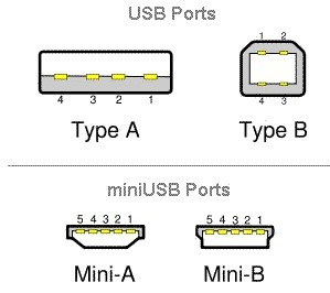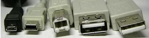 圖中從左往右依次是:MiniUSB公口(A型插頭)、MiniUSB公口(B型插頭)、USB公口(B型插頭)、USB母口(A型插座)、USB公口(A型插頭)