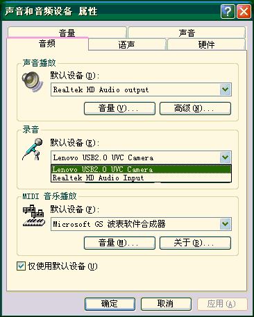 2、在彈出的對話框中選擇音頻標(biāo)簽,點擊默認(rèn)錄音設(shè)備的下拉箭頭,選擇Lenovo usb2.0 Uvc Camera,確定即可解決問題。