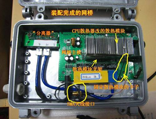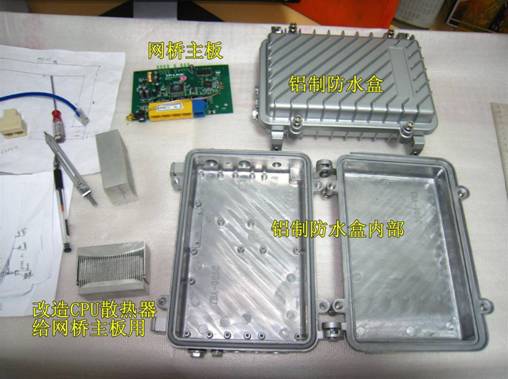 配件到齊后就是組裝了,由于主板和防水盒不配套,需要自己在板子上改絲孔(注意看板子上的電路,沒有元件且大面積沒有布線的區(qū)域才可開孔),下面加了一層塑料紙做絕緣后固定在盒子里。一直都在擔(dān)心板子的散熱問題,但又覺得那貼上去的小散熱片不夠勁,所以就考慮把CPU的散熱器改造來用。思路是把CPU散熱器一分為二后上下扣在一起放在芯片上,當(dāng)合上防水盒的時候和防水盒外殼接觸散熱。但最終受工具、加工精度等問題的困擾,沒能實(shí)現(xiàn)這目標(biāo)。最終只有做了個托架將半個散熱器固定在板子的芯片上,湊合用吧,真不行了再說吧。