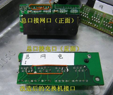 一開始還使用了網(wǎng)線三通接頭,但非常的不穩(wěn)定,不得已改造了兩個8口交換機(jī)才解決:把交換機(jī)的接口部分3個一組從主板上鋸下來,并把各引腳上相連的元件都去掉或斷路。將其中一個接口做為總進(jìn)/出線口,一個為純網(wǎng)絡(luò)信號接口,一個為電源進(jìn)/出口。將網(wǎng)絡(luò)接口和電源進(jìn)/出口的焊點(diǎn),用導(dǎo)線分別與總進(jìn)/出線口的相應(yīng)位置連起來就OK了(見下圖)。一共做了4個,分別冒充兩套“合路器”與“分離器”。不考慮供電不足這個因素的影響,這套接口的穩(wěn)定性還是非常錯的,就是可憐了那兩臺交換機(jī),就剩這么點(diǎn)殘骸了。如果有朋友也想這樣折騰,我勸他還是別費(fèi)勁了,用現(xiàn)成的POE設(shè)備吧,穩(wěn)定還省心。