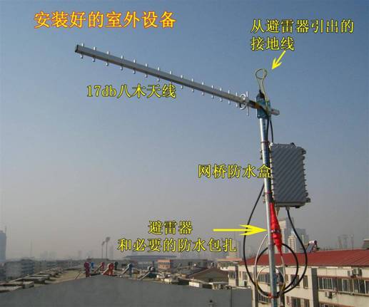 在樓頂架天線,最重要的就是防雷,千萬不要讓你的設(shè)備成為半徑500米內(nèi)的最高點(diǎn)(如果不幸成為最高點(diǎn),那就認(rèn)真加強(qiáng)防雷措施吧)。強(qiáng)烈建議用避雷器連接天線和網(wǎng)橋,而且避雷器的接地端一定要用2.5平方以上線號的銅線和大樓的接地相連,且避雷線阻抗不要大于4歐姆。其它的能省就省,但與安全相關(guān)的方面一定不能偷懶。這樣只是對直擊雷進(jìn)行了簡單的防范,最好同時再配一個網(wǎng)線防雷接口和防雷插座,避免感應(yīng)雷的襲擊。總之一句話:安全第一。