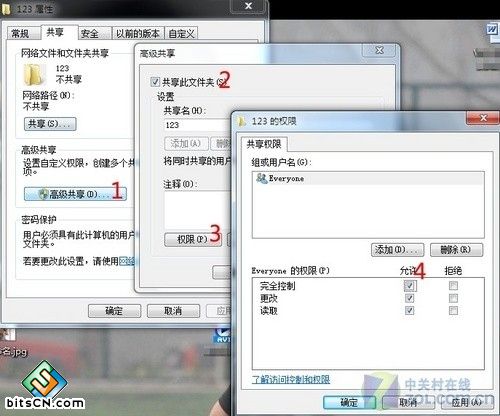 從上圖中大家可以看出,筆者已經(jīng)將文件夾“123”賦予了Everyone帳戶完全控制的權(quán)限。(具體設(shè)置方法,大家按照圖中標(biāo)注的紅色的數(shù)字1、2、3、4操作即可,筆者不做更多敘述。)