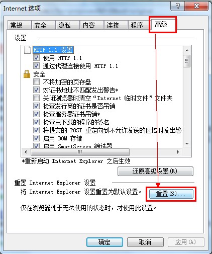 5.單擊“高級”選項(xiàng)卡,然后單擊“重置”。