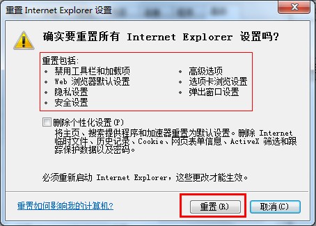 6.在“重置 Internet Explorer 設(shè)置”對話框中,單擊“重置”。如果還希望刪除瀏覽歷史記錄、搜索提供程序、加速器、主頁、跟蹤保護(hù)和 ActiveX 篩選數(shù)據(jù),請選中“刪除個性化設(shè)置”復(fù)選框。