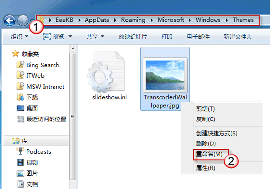 將 TranscodedWallpaper.jpg 重命名為 TranscodedWallpaper.old。(如果文件后綴名不可見,按一下“Alt+T”調(diào)出工具欄,打開“工具->文件夾選項”,在“查看”選項卡上取消勾選“隱藏已知文件的擴展名”。)