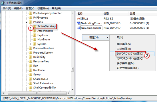 單擊展開 ActiveDesktop,在右邊細節(jié)窗口右鍵鼠標(biāo),選擇“新建->DWORD 值”,命名為 NoChangingWallPaper.