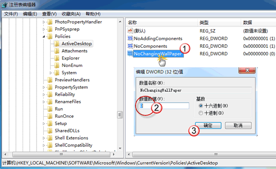 為新建值 NoChangingWallPaper 賦值。1表示阻止更改,0表示允許更改。這里,我們將其賦值為0。