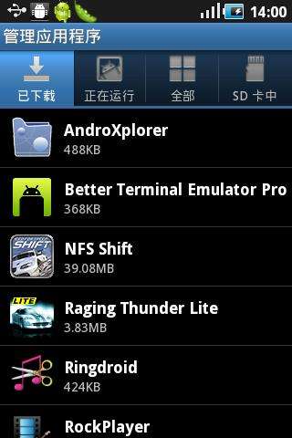 等待手機(jī)重啟后(如果手機(jī)沒有自動重啟,手動重啟一下吧),打開手機(jī)主菜單-設(shè)置-應(yīng)用程序-管理應(yīng)用程序-已下載,隨便打開一個軟件,你會發(fā)現(xiàn)“移至SD卡”選項(xiàng)可用了。這樣我們就可以很方便地把軟件移動到TF卡中,再也不用擔(dān)心ROM不足了。移動過去的軟件,依然可以移動回手機(jī)ROM中。這樣做的另一個好處是,刷機(jī)以后,不需要再重新安裝軟件了,只需要把TF卡插上就可以了。