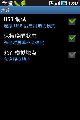 2. 同樣與《易筋經(jīng)》中一樣,主菜單-設(shè)置-應(yīng)用程序-開發(fā)-USB調(diào)試,在前面的小框里打勾,啟動手機(jī)的USB調(diào)試,這時電腦應(yīng)該已發(fā)現(xiàn)新硬件并找到了手機(jī)。(已完成root的這一步同樣可以跳過)