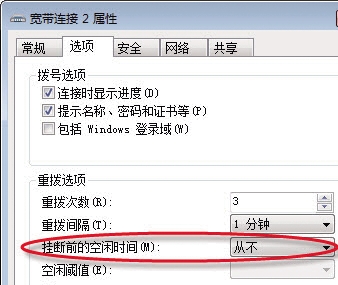 方法是右鍵單擊任務(wù)欄網(wǎng)絡(luò)連接圖標(biāo),選擇“打開網(wǎng)絡(luò)和共享中心”,點(diǎn)擊“更改適配器設(shè)置”(如圖1),右鍵單擊網(wǎng)絡(luò)連接圖標(biāo),并選擇“屬性”選項。切換到“選項”設(shè)置頁,將“掛斷前的空閑時間”選為“從不”(如圖2)。