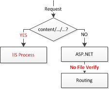 在深入理解ASP.NET MVC(2)中,討論過MVC框架的路由機制,其中提到“可以通過設(shè)置RouteCollection的RouteExistingFiles為true,使得路由不匹配靜態(tài)文件(注意true是不匹配,這個命名和奇怪)。”因此,我們可以這樣設(shè)置,以使得MVC不對靜態(tài)文件進行檢查,這樣又可以提高一點性能。最終請求會像下圖那樣被serve