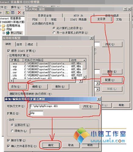 3、接下來在IIS中進(jìn)行設(shè)置,打開默認(rèn)網(wǎng)站-〉屬性對話框,切換到“主目錄”選項卡,然后點(diǎn)“配置”按鈕打開“應(yīng)用程序配置對話框”,點(diǎn)“添加”按鈕打開“添加/編輯應(yīng)用程序擴(kuò)展名映射”對話框。在“可執(zhí)行文件”輸入框中,指向c:\php\php5isapi.dll,在“擴(kuò)展名”輸入框里面輸入“.php”(注意:在windows XP下要加“.”,windows2000下好像不需要。不包括引號),并選中“腳本引擎”和“檢查文件是否存在”兩個復(fù)選框,一路確定并退出IIS。