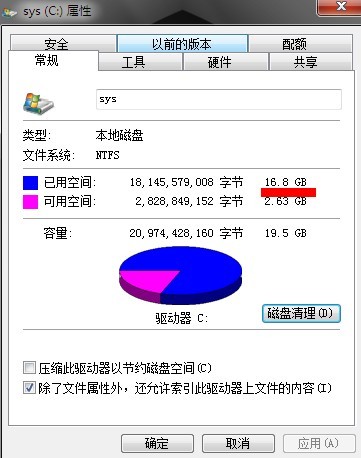 - 點(diǎn)擊屬性,會彈出屬性界面對話框如下圖,看到在常規(guī)下會有個(gè)磁盤清理。