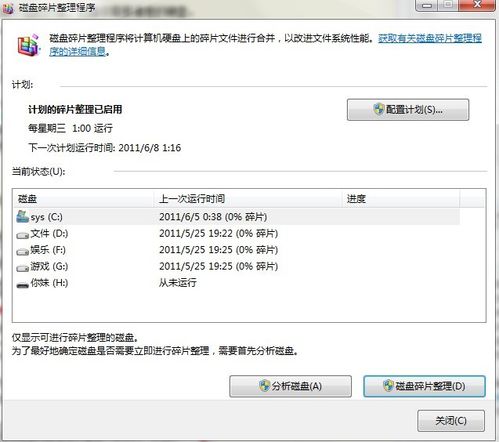 - 彈出磁盤碎片整理程序,可以看到有配置計(jì)劃,分析磁盤,碎片整理等按鈕。