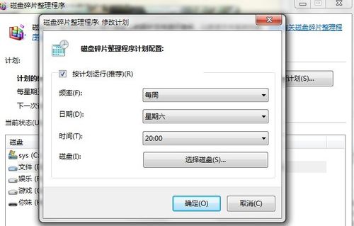 - 點(diǎn)擊配置計(jì)劃可以看到設(shè)置每個(gè)星期自動磁盤碎片整理(又一次見到WIN7的人性化),當(dāng)然如果你不喜歡的話可以不招待這個(gè)計(jì)劃。