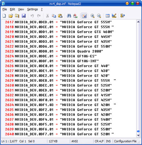 打開nvac.inf,在[NVIDIA_Devices]字段添加幾行(根據(jù)你的設(shè)備ID也可以只用一行):