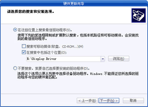 設(shè)備管理器右鍵視頻控制器→更新驅(qū)動(dòng)程序→從列表或指定位置安裝→瀏覽,指定Display.Driver,下一步,完成。