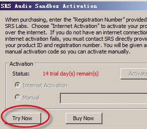 下載安裝SRS Audio Sandbox工具,運行軟件如果有注冊碼請輸入注冊碼并點擊“activate”激活,如果沒有注冊碼點擊“Try Now”試用。網(wǎng)上有這個軟件的注冊機和漢化版,如果需要的話可以自行下載。