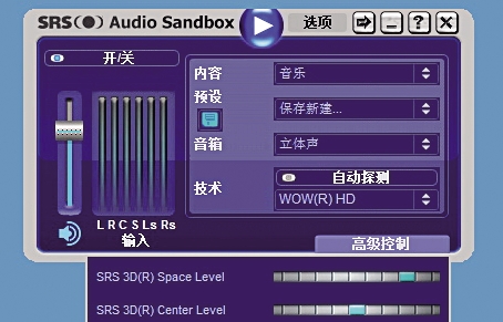 SRS Audio Sandbox主界面中,點擊“ON/OFF”開啟關閉音效。只有先打開軟件音效,才能進行進一步設置。點擊“高級控制”,逐個調(diào)節(jié)滑塊,直到滿意聲音的表現(xiàn)為止。建議大家一面播放音樂一面調(diào)整,這樣比較直觀。