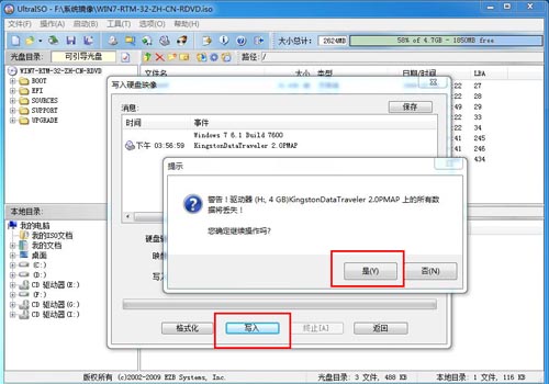 點(diǎn)擊寫(xiě)入之后選擇是,等待10幾分鐘后,Win7的U盤(pán)啟動(dòng)盤(pán)就制作完成了。在使用的時(shí)候只要在BIOS里調(diào)為“USB Hard Driver”就搞定了,做系統(tǒng)的過(guò)程和使用光盤(pán)基本沒(méi)有區(qū)別。