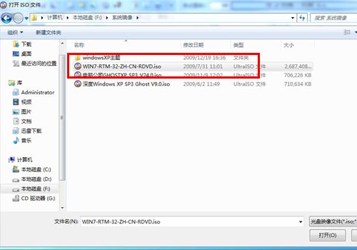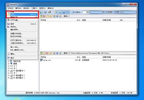 打開(kāi)UltraISO軟碟通,載入我們已經(jīng)在硬盤(pán)中準(zhǔn)備好的Windows7光盤(pán)映像。