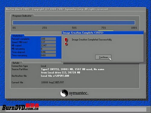 - 第10步,Ghost開(kāi)始進(jìn)行創(chuàng)建映像文件,從進(jìn)度條可以觀察到創(chuàng)建進(jìn)度。完成以后會(huì)彈出提示框,直接單擊“Continue(繼續(xù))”按鈕,如圖2009012397所示。
