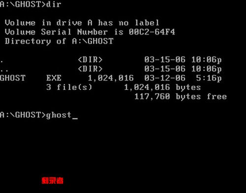 - 第1步,使用集成有Ghost2003程序的DOS啟動(dòng)光盤(pán)啟動(dòng)電腦,進(jìn)入Ghost目錄后輸入Ghost命令并按回車鍵,如圖2009012388所示。